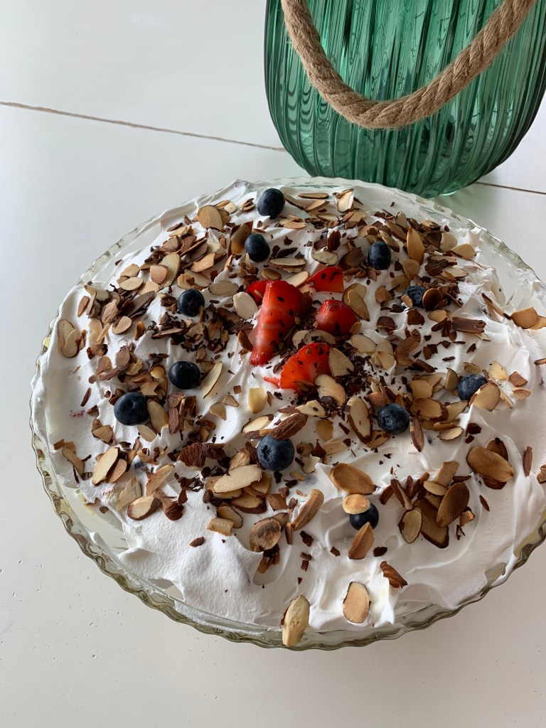 My trifle yesterday consisted of ripe, red strawberries that were sliced. I used juicy, plump blueberries and also banana that was sliced. I cubed my store bought Angel Food cake. A box of instant sugar free, fat free vanilla pudding and Lite Cool Whip pulled everything together. Toasted almond slivers crowned the top to add some crunch and texture. It was an awesome, light, and tasty end to a great meal.