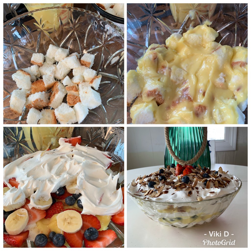 We had friends over for a cookout. Grilled chicken and scallops were the main event. Nothing better than food cooked on a charcoal grill. We had some salads as sides. I decided to make a trifle for dessert.